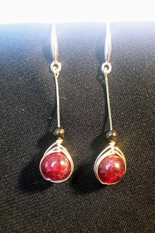 Das tiefe Burgunderrot der Hauptperle zeigt die typische Farbe dieses Edelsteins, während die 2mm Perle fast schwarz erscheint und auch als Melanit bezeichnet wird.